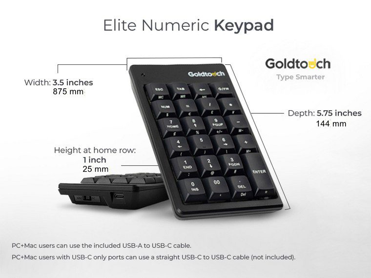 For dedicated number input without compromising desk space, select the Goldtouch Elite Numeric Keypad. Its new compact design and tactile Cherry MX Red mechanical keys provides a satisfying and efficient data entry experience.